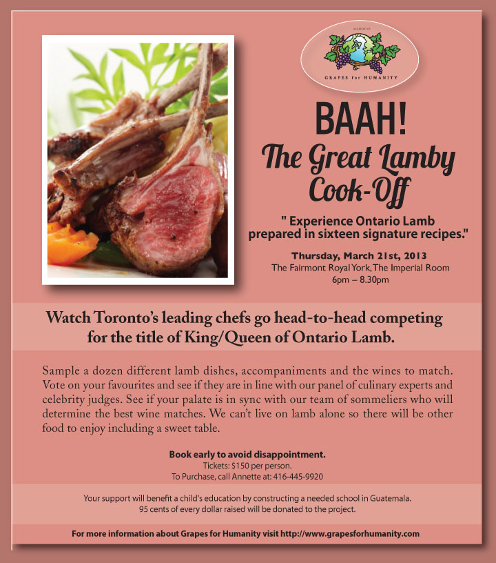 Monday, February 25: A meeting with Doris Maculan Bradley at George Brown to discuss Grapes for Humanity’s fund-raiser event on March 21st, BAAH! The Great Lamby Cook-Off.![]()