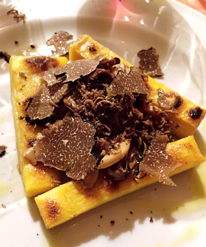 We lunched at Antica Trattoria da Bepi in Marano di Vapolicella – an amazing meal: mushrooms and polenta grilled over vine wood with black truffle shavings, followed by Biogli pasta with lamb sauce and Monte Veronese cheeses aged six months, twelve months and three years. Dessert: chocolate cake. The accompanying wines: