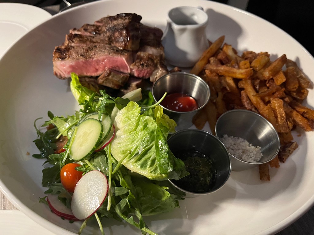 With steak to follow, a bottle of Meldville Barrel Select Syrah unfiltered 2022 by Derek Barnett (Niagara Peninsula). Chef/owner Eric Peacock comped us dessert of lemon pound cake. No candles.